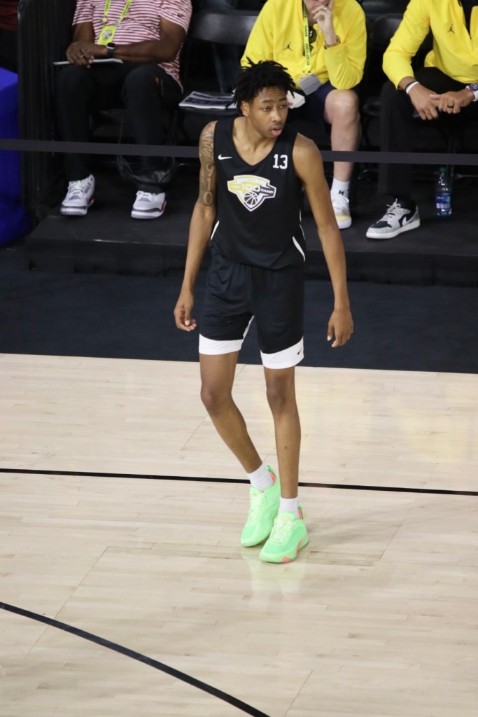 2025 6’9” Bryson Tiller of Overtime Elite was all business in the early morning session. Displaying comfortable range out to 18 feet. Tiller college ready frame, he has size an a ton of skills to compliment. I was impressed with him, playing with his back to the basket. He just showed us that he has more in his package skill set.